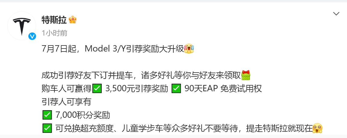 雖然中國(guó)汽車工業(yè)協(xié)會(huì)發(fā)布聲明從承諾書中刪除涉及“價(jià)格”表述,但在一些行業(yè)人士看來,價(jià)格戰(zhàn)是商業(yè)主體競(jìng)爭(zhēng)的市場(chǎng)行為,汽車行業(yè)也不例外,諷刺的是,剛剛簽訂了協(xié)議,新能源汽車領(lǐng)軍者特斯拉于簽訂協(xié)議次日(7日)變相降價(jià),7月7日起升級(jí)Model 3/Y引薦獎(jiǎng)勵(lì)。成功引薦好友下訂并提車,購(gòu)車人可獲得3500元引薦獎(jiǎng)勵(lì)(可用于抵扣車輛尾款),90天EAP免費(fèi)試用權(quán),引薦人可享7000積分獎(jiǎng)勵(lì)、可兌換超充額度、兒童學(xué)步車等。