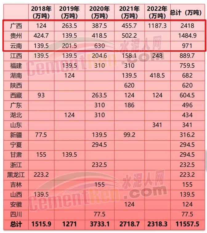 據(jù)水泥人網(wǎng)信息中心數(shù)據(jù),近五年來(lái),全國(guó)新增水泥熟料總產(chǎn)能11557.5萬(wàn)噸,投產(chǎn)時(shí)間主要集中在2020~2022年。從各地區(qū)的新增分布情況來(lái)看,排名靠前的是廣西、貴州、云南三個(gè)區(qū)域。