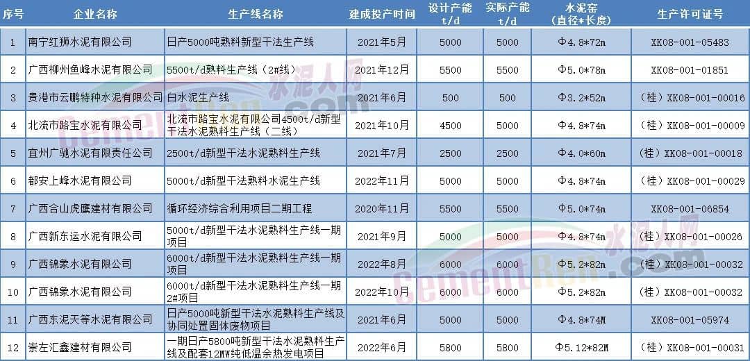 2020-2022年年間廣西區(qū)域12條新建線投產(chǎn),涉及企業(yè)包括紅獅水泥、魚峰水泥、寶路水泥、廣馳水泥、合山虎鷹、新東運(yùn)水泥、錦象水泥、東泥天等等多家企業(yè)。