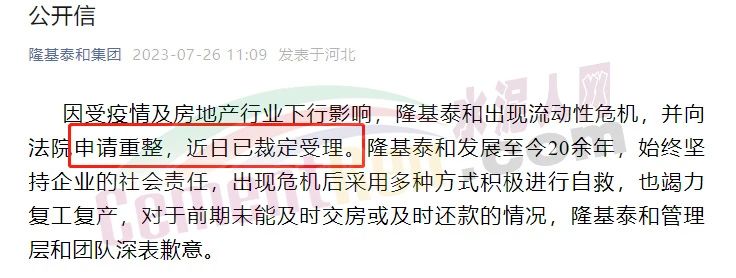 近日,隆基泰和發(fā)布公開信,因受疫情及房地產(chǎn)行業(yè)下行影響,企業(yè)出現(xiàn)流動性危機(jī),并向法院申請重整,近日已裁定受理。其還表示,出現(xiàn)危機(jī)后采用多種方式積極進(jìn)行自救,也竭力復(fù)工復(fù)產(chǎn),對于前期未能及時交房或及時還款的情況,隆基泰和管理層和團(tuán)隊深表歉意。