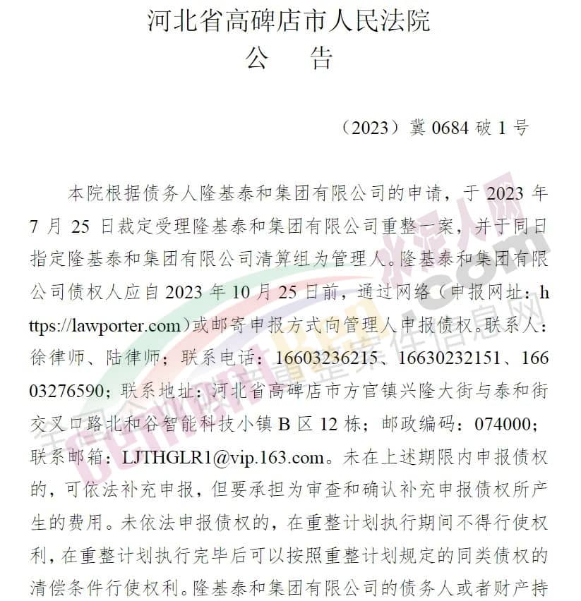 據(jù)水泥人網(wǎng)了解,7月25日,隆基泰和集團(tuán)新增一起破產(chǎn)重整案件,破產(chǎn)重整的申請人和被申請人均為隆基泰和集團(tuán),經(jīng)辦法院為河北高碑店法院。另外,高碑店市人民法院定于2023年11月9日上午9時30分通過網(wǎng)絡(luò)會議形式召開第一次債權(quán)人會議,依法申報債權(quán)的債權(quán)人有權(quán)參加債權(quán)人會議。