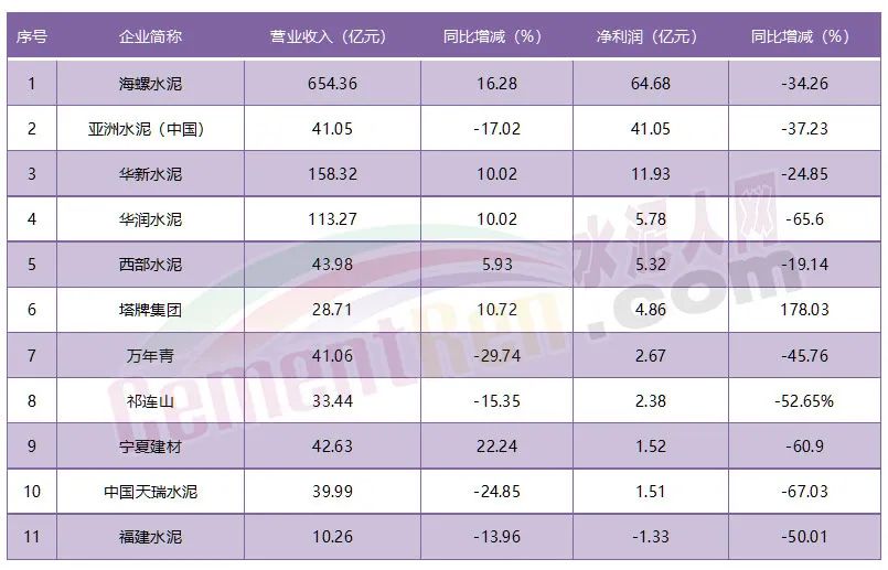 海螺水泥、亞洲水泥、華新水泥、華潤水泥、西部水泥、萬年青寧、祁連山、寧夏建材、天瑞水泥等9家企業(yè)凈利潤等均有不同程度的下滑;福建水泥虧損1.33億。