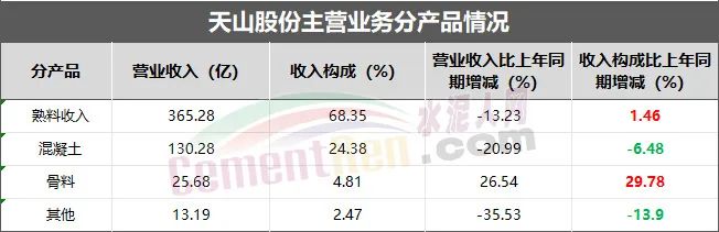 今年上半年,天山股份骨料營業收入同比去年增加26.54%,營收占比同比去年增加29.78%。據水泥人網了解,2023年1—6月,天山股份銷售水泥10692萬噸,同比下降3.01%;銷售熟料1473萬噸,同比下降12.48%;銷售商混3375萬方,同比下降10.22%;銷售骨料6342萬噸,同比增長25.53%。