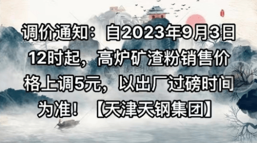 天津天鋼集團于9月1日和9月3日兩次通知上調高爐礦渣粉銷售價格,累計上調10元/噸,上調后S95散裝報價115元/噸。