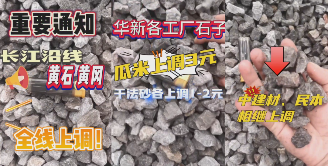 沿江貿易商也于8月30日通知,黃石、黃岡華新各工廠石子瓜米上調3元/噸,干法砂上調1-2元/噸。中建材、民本相繼跟進上調。并表示,長江沿線多家砂石價格上漲,九月中下旬或將到達需求峰值。