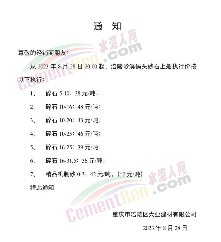 重慶市涪陵區大業建材通知,自2023年8月28日17點42分碎石(5-10、10-16、16-25)上調2元/噸,機制砂上調2元/噸。