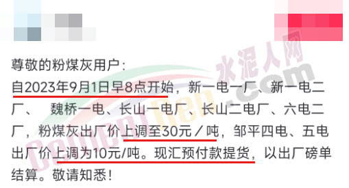 據山東貿易商通知,自2023年9月1日早8點開始,新一電一廠、新一電二魏橋一電、長山一電廠、長山二電廠、六電二廠,粉煤灰出廠價上調至30元/噸,鄒平四電、五電出廠價上調為10元/噸。現匯預付款提貨,以出廠磅單結算。