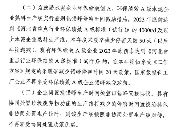 在2023年底前達A級標準的企業不僅要停窯,而且減免措施僅限擁有4000t/d及以上企業;國家級綠色工廠不再享受錯峰減免政策。調整錯峰生產時間和保民生的協同處置項目也必須在規定的時間段內補齊等。
