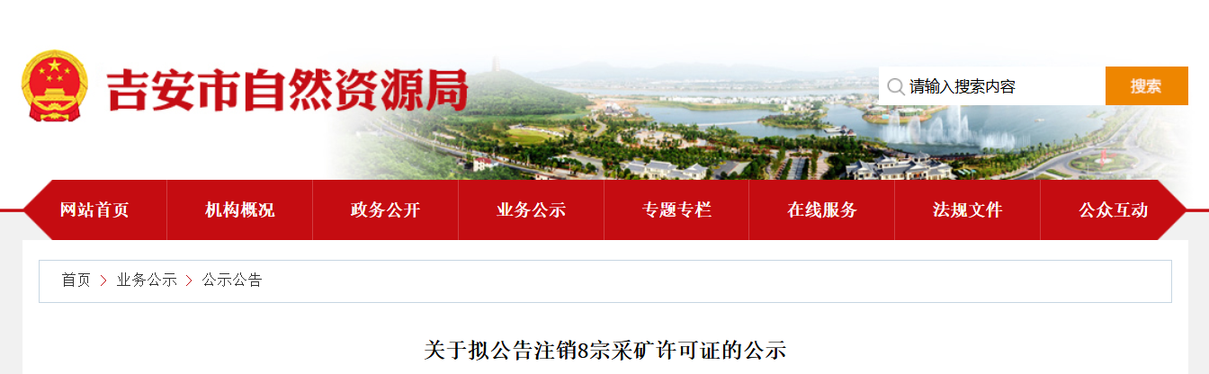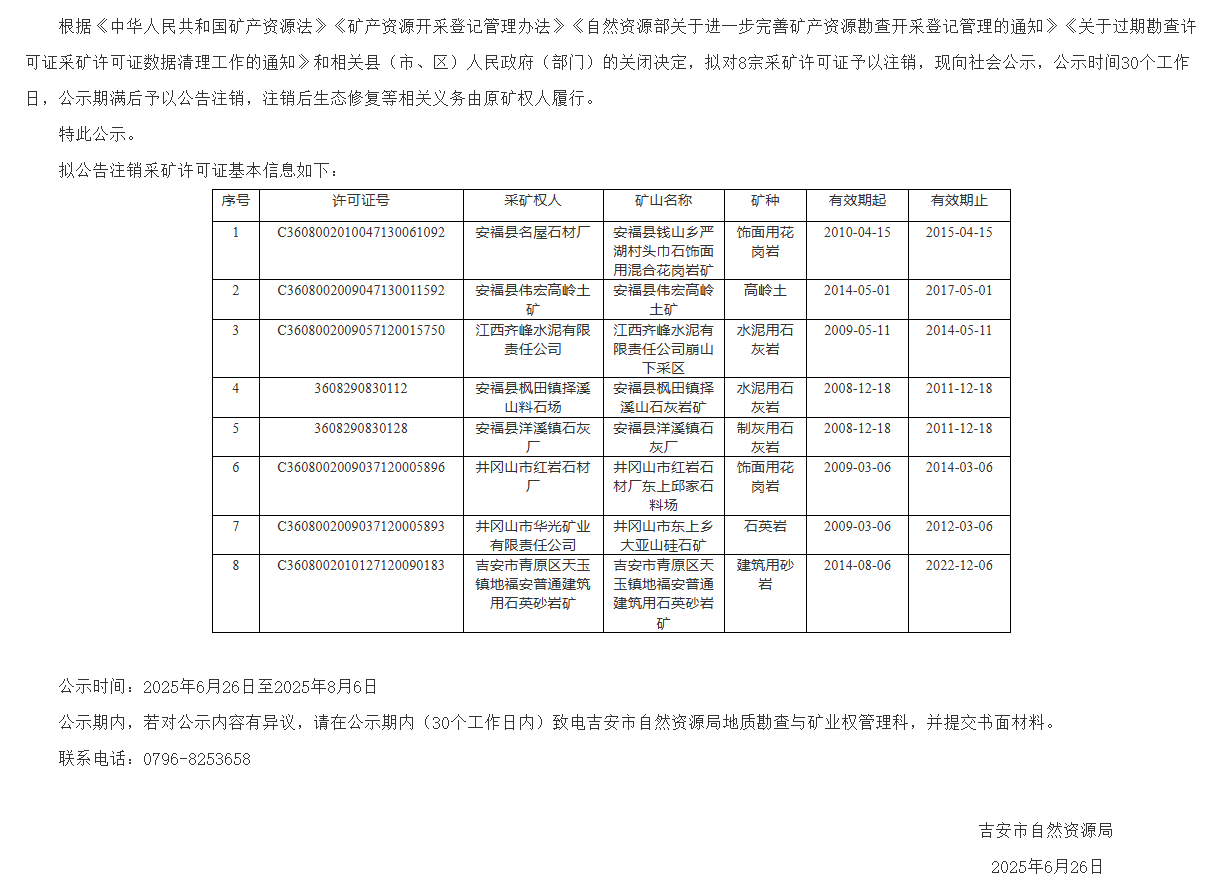 同期吉安市自然資源局發(fā)布關(guān)于擬公告注銷8宗采礦許可證的公示稱,擬對8宗采礦許可證予以注銷。