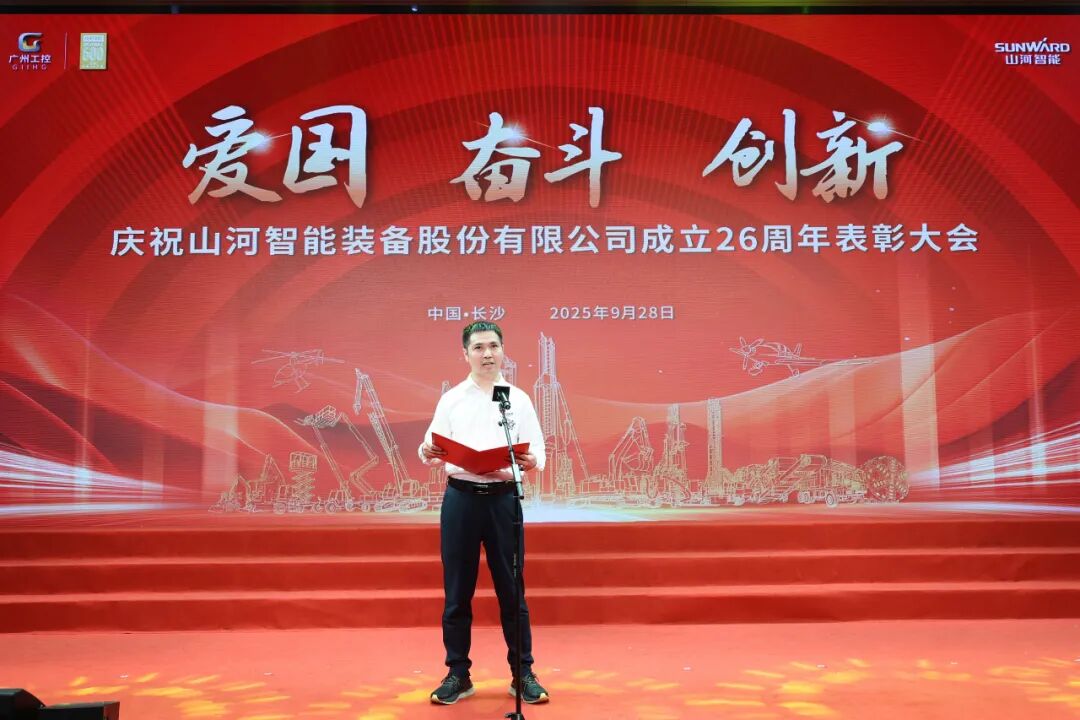 大會在莊嚴的《國歌》聲中拉開帷幕。付向東為新晉十年老員工授勛。夏志宏等領導為在慶祝山河智能成立26周年系列活動中獲獎的單位和個人頒獎。