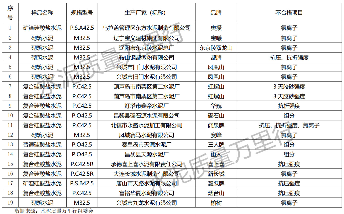 另一方面是質(zhì)量達(dá)標(biāo)率偏低。80批次樣品中,19批次檢測(cè)結(jié)果不符合國(guó)家標(biāo)準(zhǔn)要求,占比23.75%。不合格項(xiàng)目集中在氯離子含量、強(qiáng)度性能及組分三大類:其中,興城市舊門水泥有限公司、遼陽(yáng)市東京陵水泥總廠等8家企業(yè)的產(chǎn)品氯離子超標(biāo);鞍山鋼都微粉有限公司“都牌”砌筑水泥等6批次產(chǎn)品,同時(shí)存在抗壓與抗折強(qiáng)度不合格問(wèn)題;昌黎縣碣石源水泥有限公司、秦皇島市天源水泥廠等企業(yè)的3批次產(chǎn)品,因組分不符合標(biāo)準(zhǔn)。