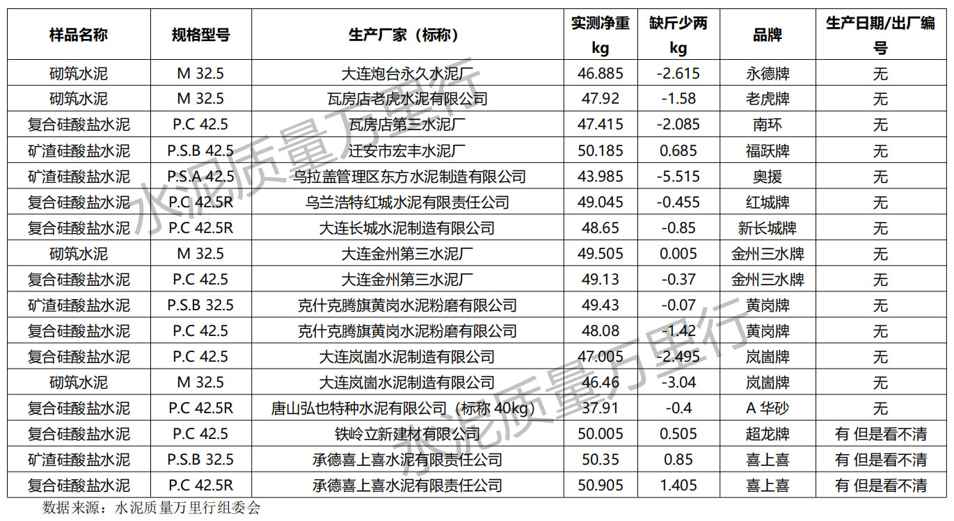近日,水泥質(zhì)量萬(wàn)里行組委會(huì)發(fā)布泛東北地區(qū)流通領(lǐng)域水泥抽檢新結(jié)果。在已完成的80批次抽檢中,袋重不足問(wèn)題突出,同時(shí)近四分之一產(chǎn)品存在質(zhì)量不達(dá)標(biāo)情況,部分企業(yè)還涉嫌資質(zhì)與商標(biāo)違規(guī)。
